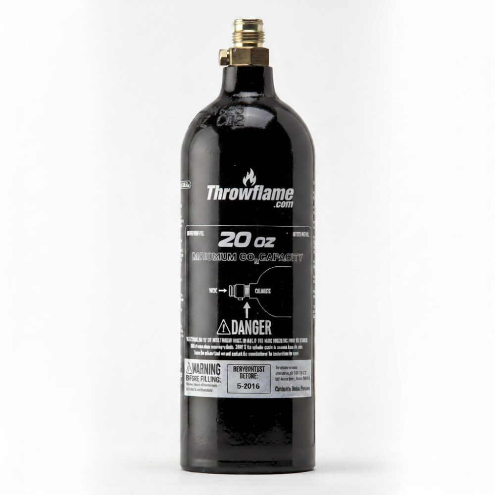 Quickly repressurize your flamethrower with this extra refillable 20oz CO2 tank. These tanks can be refilled at your local sporting goods, paintball, or air gas supply store for about $3. They are commonly referred to as “20oz paintball CO2 tanks”.